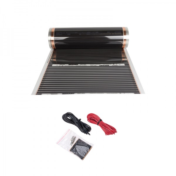 В комплект входит: нагревательная пленка корейского производства (рулон в коробке), клеммы для соединения пленки с токоведущим проводом, изоляционный скотч, электрические провода.