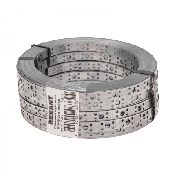 Представляет собой прямую стальную ленту с перфорацией. Отличается высокой прочностью на излом и гибкостью, поэтому может принимать нестандартную форму. Цинковое покрытие защищает ленту от коррозии и продлевает срок ее службы. Монтируется при помощи стандартных гвоздей и шурупов. Ножницами по металлу можно отрезать фрагмент ленты любой длины.
