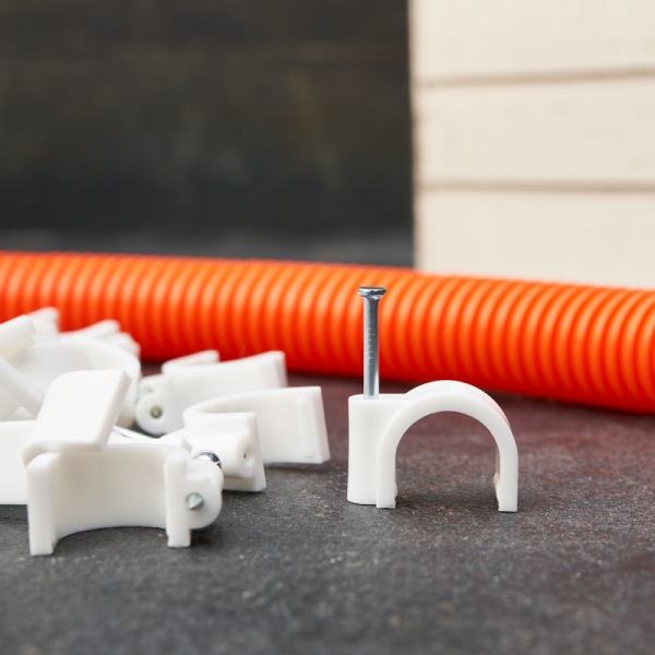 Круглый крепеж 16 мм с гвоздем предназначен для фиксации круглого кабеля к деревянной поверхности. Такой крепеж будет особенно полезен для использования на даче или в частном деревянном доме.