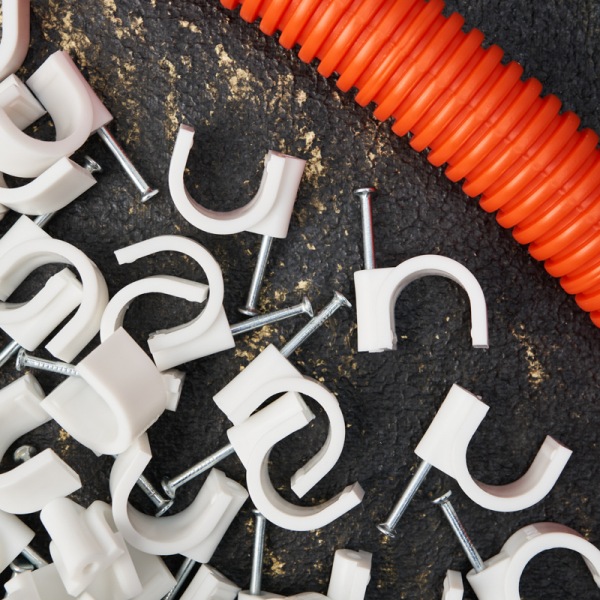 Представляет собой дугообразную скобу белого цвета, выполненную из качественного пластика, с гвоздем в специальном отверстии. Скоба используется для мгновенного и надежного крепления проводов и кабелей к поверхностям стен, несущих конструкций и потолков. Гвоздь выполнен из закаленной стали, что позволяет закрепить его даже в плотной и твердой древесине без риска погнуть или сломать.