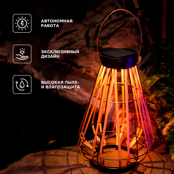 Светильник Тростник – это изысканный элемент садового декора, предназначенный для создания дополнительного освещения или акцентной подсветки. Изделие можно установить на столе в беседке или на веранде, а также подвесить на деревьях, арках или садовых скульптурах.