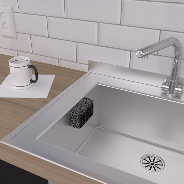 Держатель предназначен для хранения губок и других мелких предметов. Этот простой, но функциональный аксессуар помогает сохранить порядок на рабочей поверхности или в раковине.