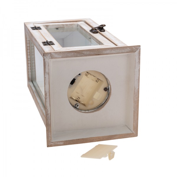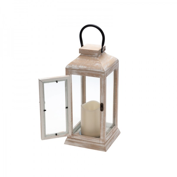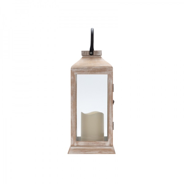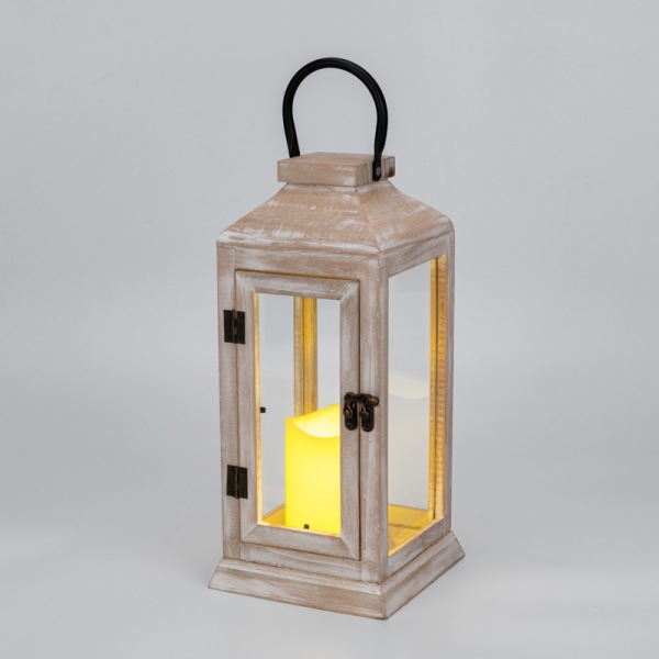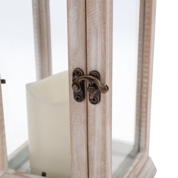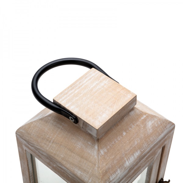 Корпус фонаря изготовлен из натурального дерева и имеет высоту 38 см. В верхней части корпуса предусмотрена петля, с помощью которой фонарь можно подвесить.