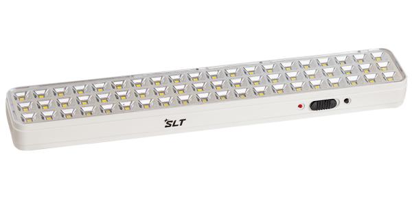 Аварийный светильник SLT (Количество светодиодов SMD - 60 штук, световой поток 344 люмен, непостоянный режим работы (DC), 187-242В, сменный литий-ионный аккумулятор напряжением 3,7В емкостью 2200 мАч, типоразмер 18650, защита аккумулятора от глубокого разряда и перезаряда, свечение до 6 часов, 340х55х30мм , масса 0,25кг, потребляемая мощность от сети 1 Вт, мощность источника света 3 Вт. 0…+40, IP41, гарантия 12 месяцев)