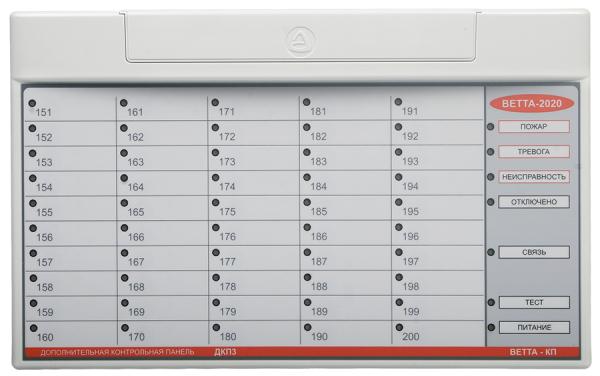 Дополнительная контрольная панель. Обеспечивает контроль до 50-и адресных зон объектовых приборов под управлением панели «ВЕТТА-ОКП». В зависимости от литеры отображают состояние адресных зон с диапазонами адресов 151…200. Питание от внешнего ИП 12 В.