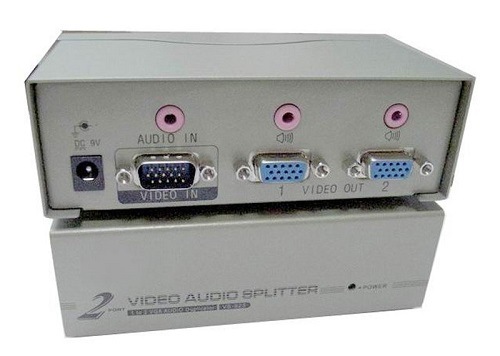 Разветвитель- 1VGA+1Стерео Аудио вх./2 VGA+2 Стерео Аудио. Расстояние передачи – до 50 м; Разрешение: до 1920х1440, 60 Гц; Подключение VGA(15 pin D-sub), Стерео Аудио (3,5мм). БП DC9V/1А в комплекте. Размеры (ШxВxГ): 130х42х75мм.