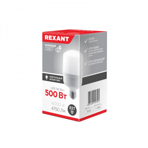 Высокомощная светодиодная лампа REXANT с нейтральным свечением 4000К и мощностью 50 Вт предназначена для освещения комнат, коридоров, бытовых помещений, промышленных объектов и для освещения улиц, при условии монтажа во влагостойкий светильник.