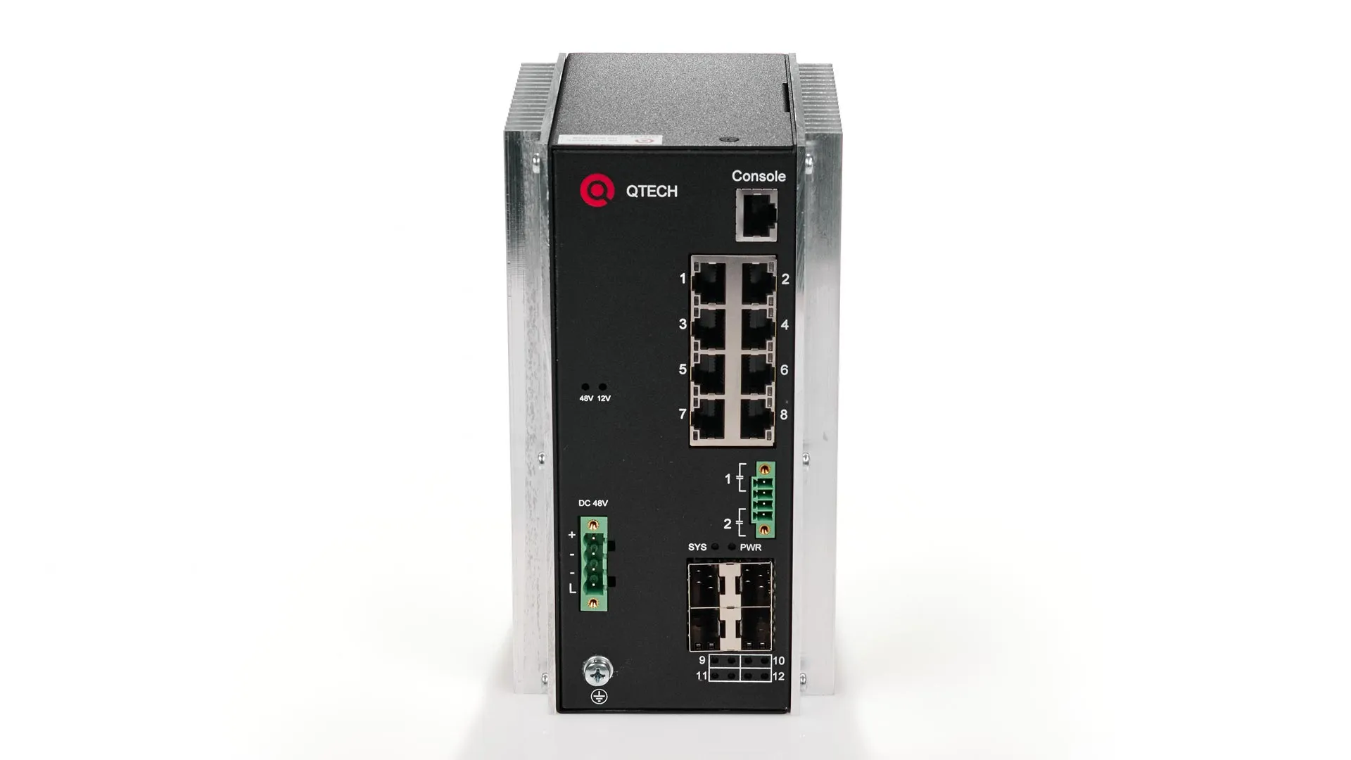 Управляемый индустриальный коммутатор уровня L3 с поддержкой PoE 802.3af/at, 8 портов 10/100/1000BASE-T, 4 порта 1000 BASE-X SFP, 4К VLAN, 16K MAC-адресов, консольный порт (на передней панели), встроенный блок питания 48В DC (на передней панели), размеры коммутатора ШхГхВ (100х125х185)