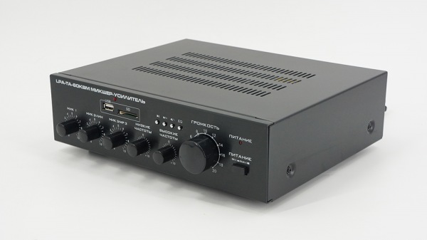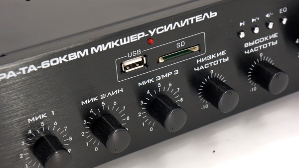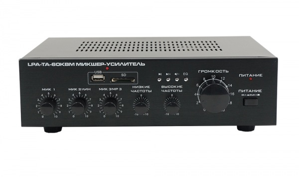 - Усиление аудио сигналов от нескольких источников; Регулирование уровня входных/выходных сигналов; Регуляторы низких и высоких частот; Индикация питания, сигнала; Защита от перегрузок, короткого замыкания и перегрева; Встроенный усилитель на 60 Вт; MP3-проигрыватель (USB/SD); Линейный и микрофонный входы; Раздельное управление чувствительностью каждого входа