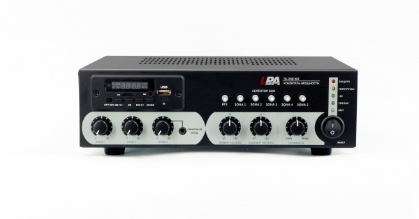 - Класс D; 5 зон; FM-тюнер; MP3-проигрыватель; слот для SD-карты; USB; Дополнительный аудиовход для внешнего источника музыки; Фантомное питание для микрофона; Режим приоритетов; Разъем phoenix для подключения линий громкоговорителей; Возможность установки в 19” стойку (с помощью крепежа LPA-A19, не входит в комплект)