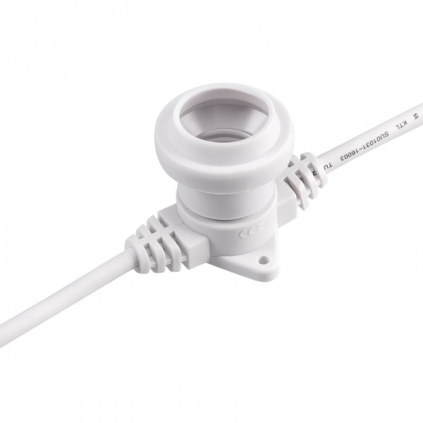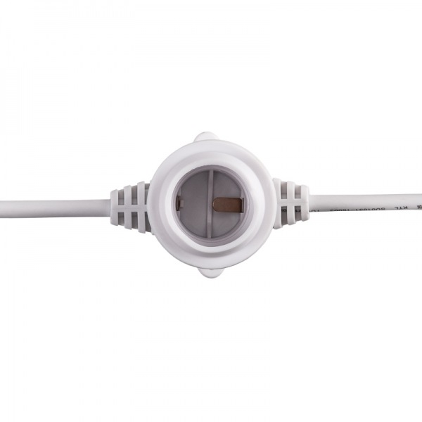 Гирлянда представляет собой морозостойкий двужильный прорезиненный ПВХ провод, на котором расположены патроны с цоколем Е27. Провод имеет круглую форму и характеризуется легкостью. Белый цвет провода гармонирует со светлыми фасадами зданий и делает гирлянду менее заметной в дневное время, сохраняя естественный вид архитектурных элементов.