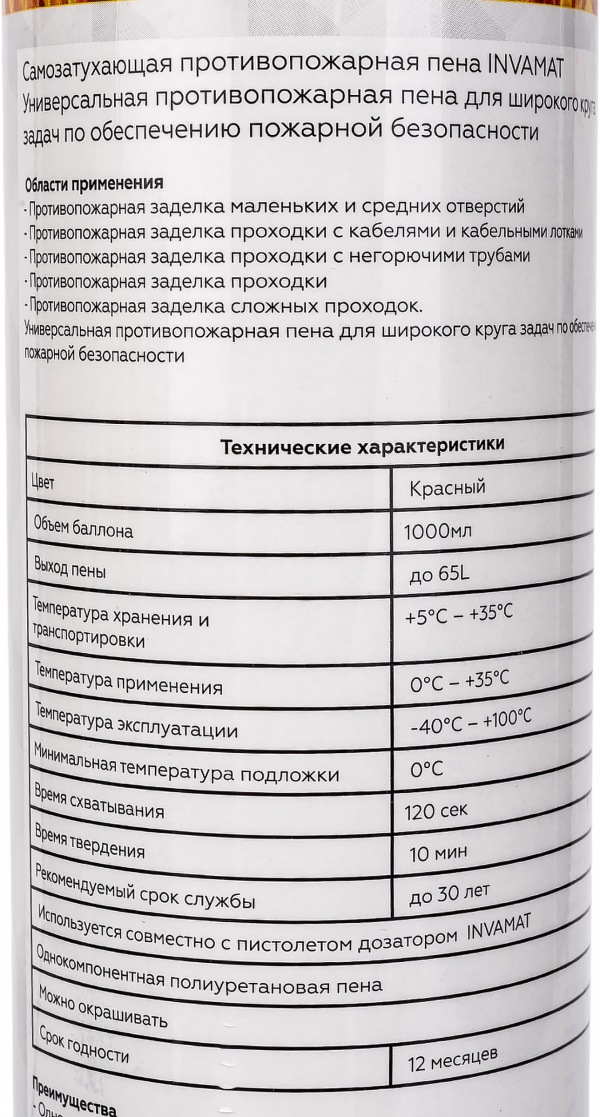 Монтажная пена INVAMAT 65 противопожарная, огнестойкая, 1000 мл 1015 - универсальная противопожарная пена для широкого круга задач по обеспечению пожарной безопасности.