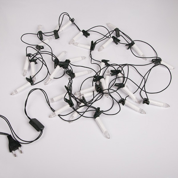 Клипсы-фиксаторы позволяют закрепить свечи на ветвях и быстро и аккуратно распределить их по всей елке. Зеленый шнур не выделяется на фоне хвои, что делает композицию особенно естественной.