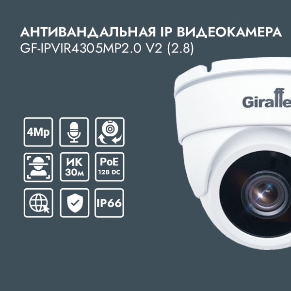 Купить Камеру видеонаблюдения Жираф GF-IPVIR4305MP2.0 v2 (2.8) (Антивандальная IP видеокамера со Встроенным Микрофоном) в Москве или заказать с доставкой по России можно на нашем сайте СинтезБезопасности.ру. Здесь вы найдете описание, фото, технические характеристики, документацию и цену на Giraffe GF-IPVIR4305MP2.0 v2 (2.8).