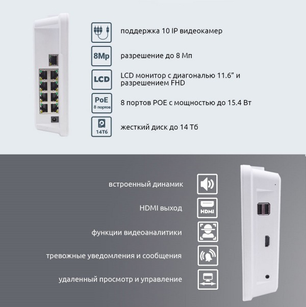Видеовыходы 1xHDMI (MAX: 2K). Звук выход 1xRCA. Компрессия H.265/H.265+/H.265AI. Встроенный динамик. HDD/SATA: 1 x 14Tb, 3.5". LAN RJ-45: 10M / 100M. 2 x USB 2.0. Питание 52V DC/2.3A. Габариты 285 x 180 x 50 мм. Диапазон рабочих температур, С 0 ~ +50||18530