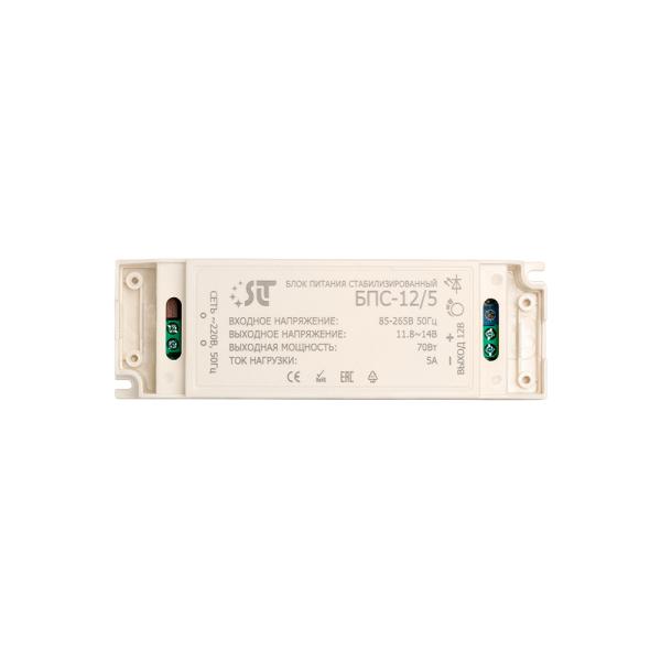 Блок питания стабилизированный SLT (Блок питания стабилизированный, предназначен для питания радиоэлектронных устройств широкого применения напряжением 12 В постоянного тока от сети переменного тока напряжением 220 В. Напряжение выходное номинальное 11.8 - 14.0В. 5А; Диапазон напряжения 85-265В; 50Гц. Потребляемая мощность по сети 220В - не более 88Вт. Выходная мощность не более 70Вт. IP 21. Диапазон рабочих температур -15...+50, Габаритные размеры 140х45х28мм. Масса 0.14кг. Защита от перегрузок по току и короткого замыкания. Регулировка выходного напряжения. Индикатор работы.)