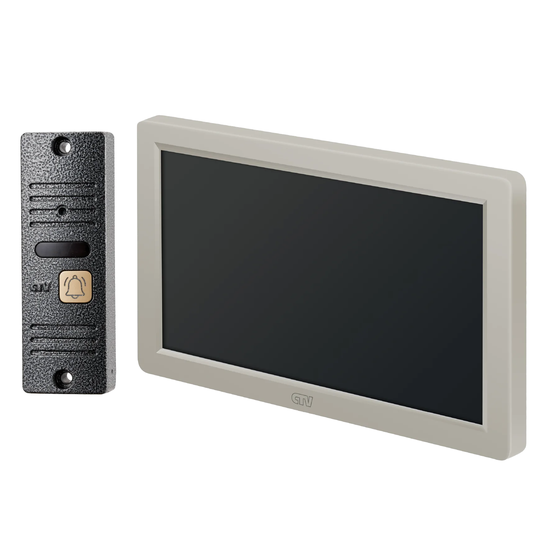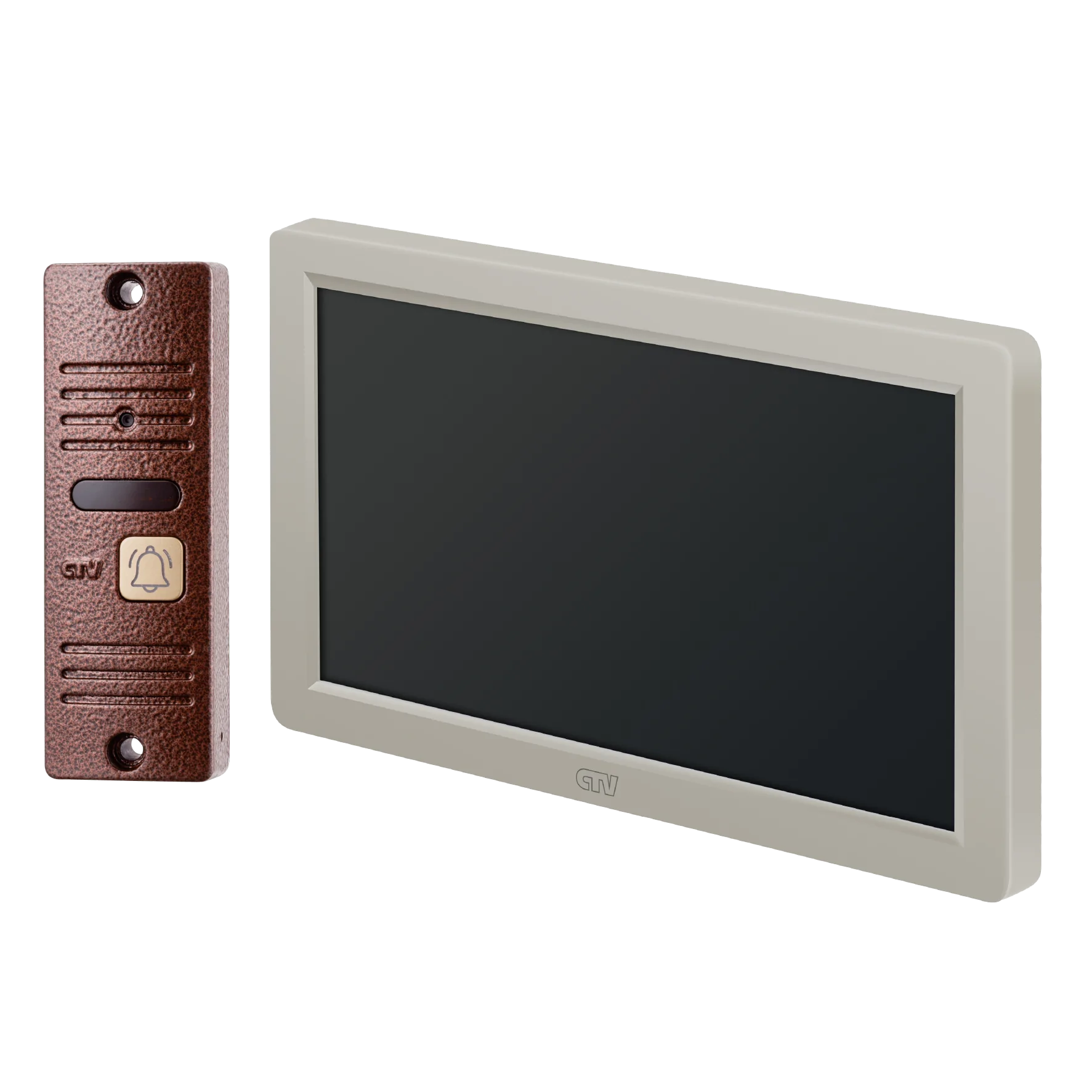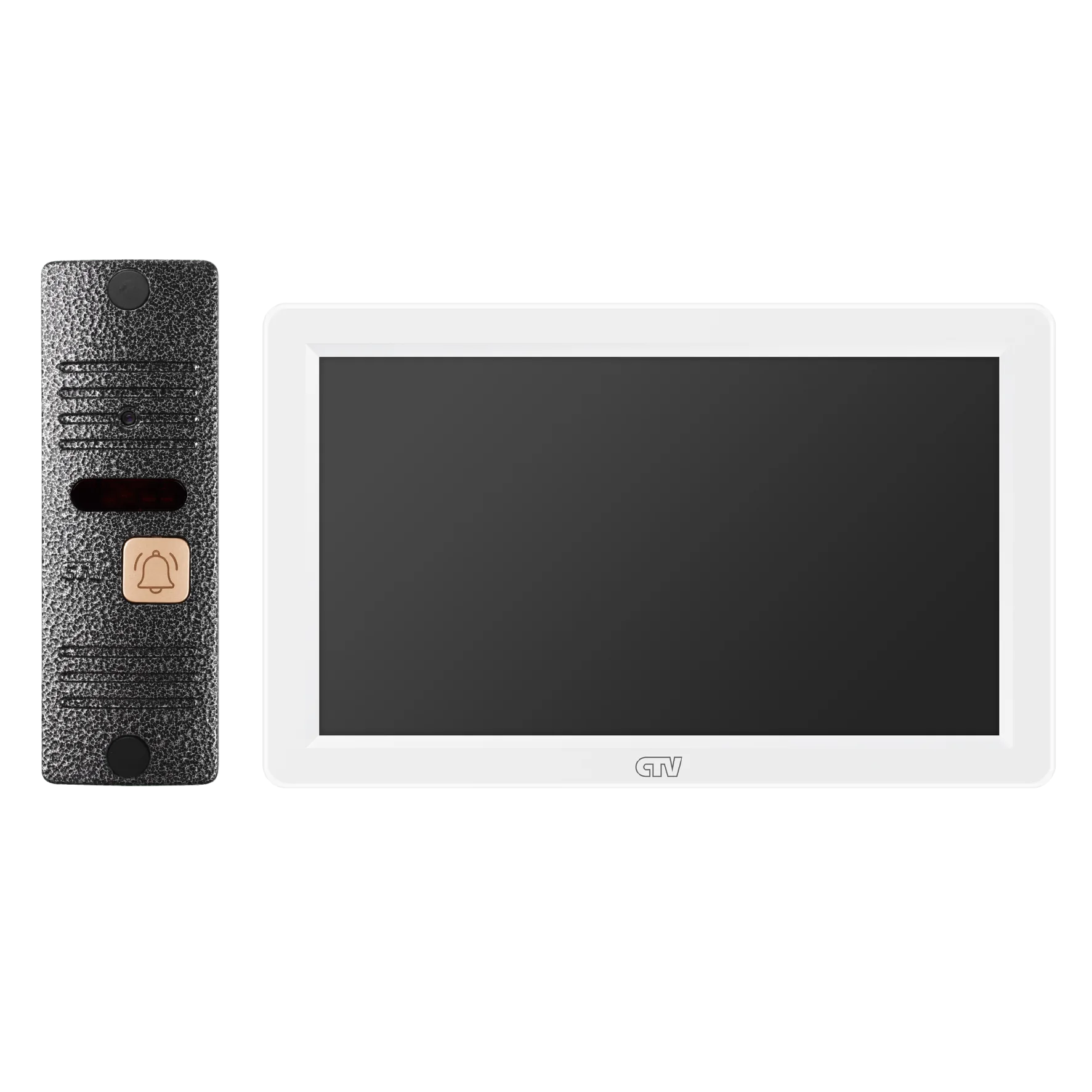 Комплект видеодомофона в одной коробке (вызывная панель CTV-D40 Plus и монитор CTV-M3722 Spectrum), поддержка формата Full HD, монитор с экраном 7", Hands free, технология Touch Screen для управления монитором, встроенная память, переключение стандартов AHD/CVBS, встроенный источник питания, подкл до 2 выз. панелей, цв. корпуса - белый/черный, панелей - бронза/серебро
