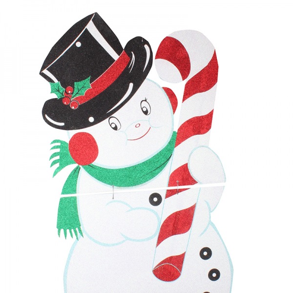 Елочная фигура "Снеговик" 69*35 см, цвет белый, шляпа черного цвета, шарф зеленого цвета, в руках карамельная палочка белого цвета с красными полосками