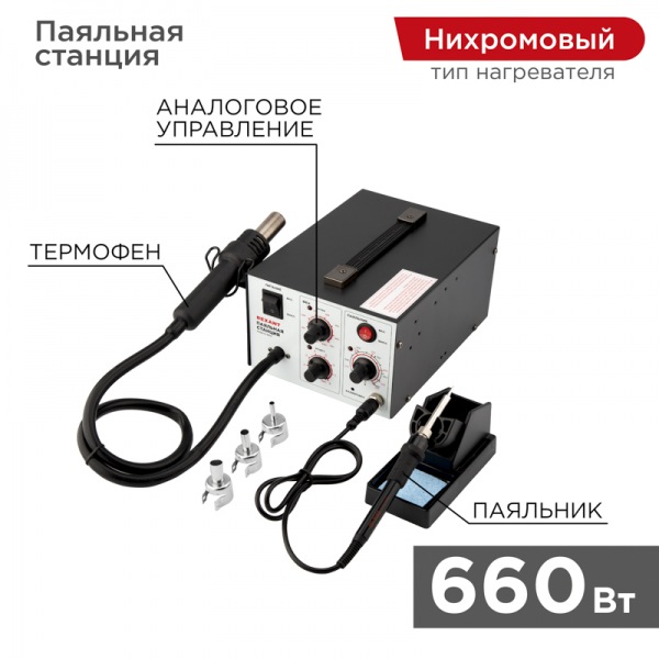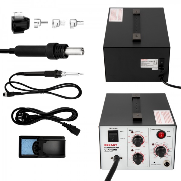 Купить Паяльная станция (паяльник+термофен) 150-500 °С (R852) Рексант в Москве или заказать с доставкой по России можно на нашем сайте СинтезБезопасности.ру. Здесь вы найдете описание, фото, технические характеристики и цену на Паяльная станция (паяльник+термофен) 150-500 °С (R852) REXANT.