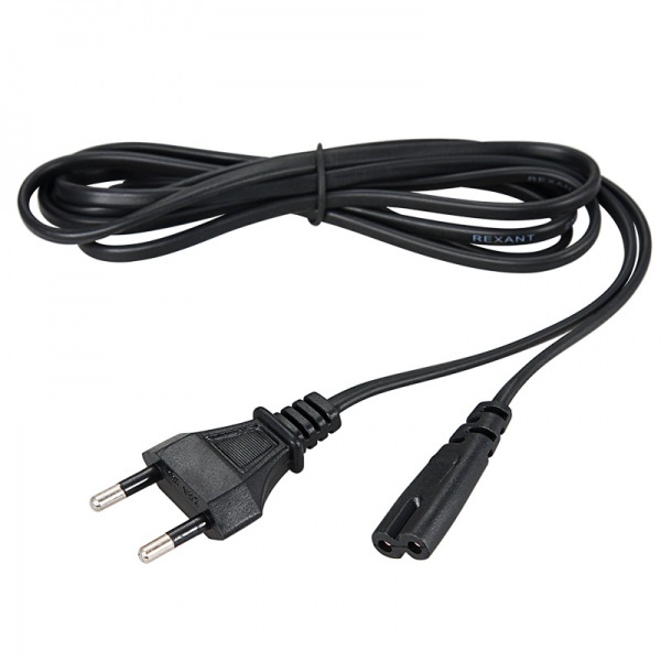 Шнур сетевой 1.8М 2x0.5мм² REXANT предназначен для подключения к сети переменного тока (AC) с напряжением 220B аудио-, видеоаппаратуры, источников питания ноутбуков, игровых консолей и других приборов, имеющих штыревой сетевой разъем типа С8 (известен из-за его формы как "восьмёрка"). Данный сетевой шнур (IEC cord) оснащен с одной стороны литой неразборной плоской вилкой (Евро), с другой литым гнездовым неполяризованным разъёмом типа C7 (евро-разъём) и двухжильным проводом с сечением жил 0.5мм². Основные характеристики: