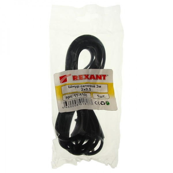 Шнур сетевой 3М 2x0.5мм² REXANT предназначен для подключения к сети переменного тока (AC) с напряжением 220B аудио-, видеоаппаратуры, источников питания ноутбуков, игровых консолей и других приборов, имеющих штыревой сетевой разъем типа С8 (известен из-за его формы как "восьмёрка"). Данный сетевой шнур (IEC cord) состоит из двухжильного провода с сечением жил 0.5мм², с одной стороны литой неразборной плоской вилкой (Евро) и с другой литым гнездовым неполяризованным разъёмом типа C7 (евро-разъём). Основные характеристики: