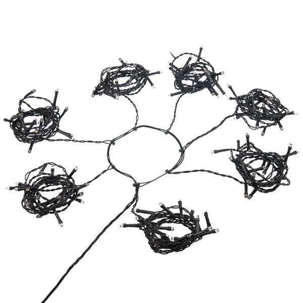 Елочная гирлянда представляет собой конструкцию, в основании которой расположено кольцо, на котором через определенные промежутки крепятся 7 нитей по 1,5 метра. Данная гирлянда предназначена для домашнего использования и идеально подойдет для украшения елок. Просто повесьте кольцо на вершину елки, расправьте нити и готово!