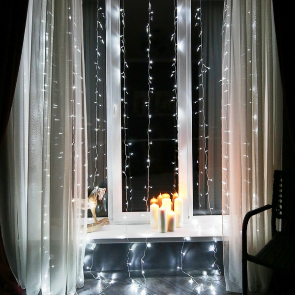 Размещение такой гирлянды дома за шторами или тюлем создаст уютную атмосферу по вечерам.