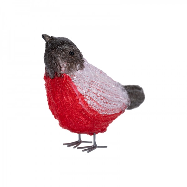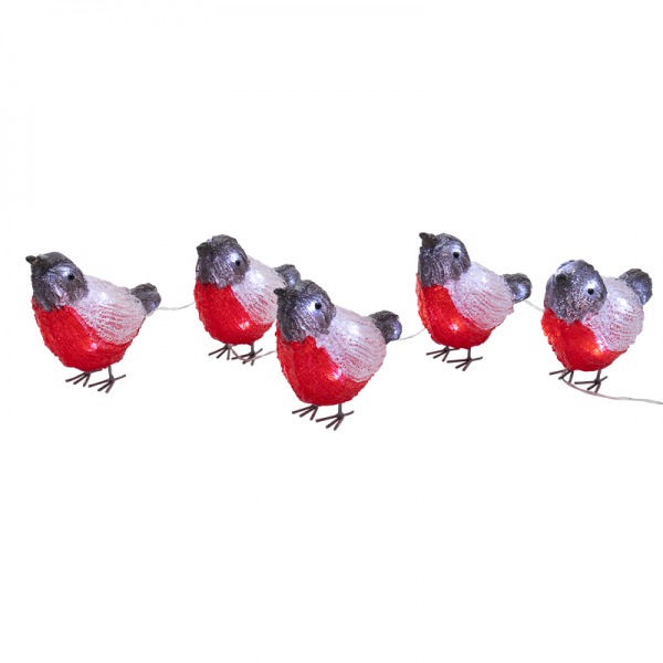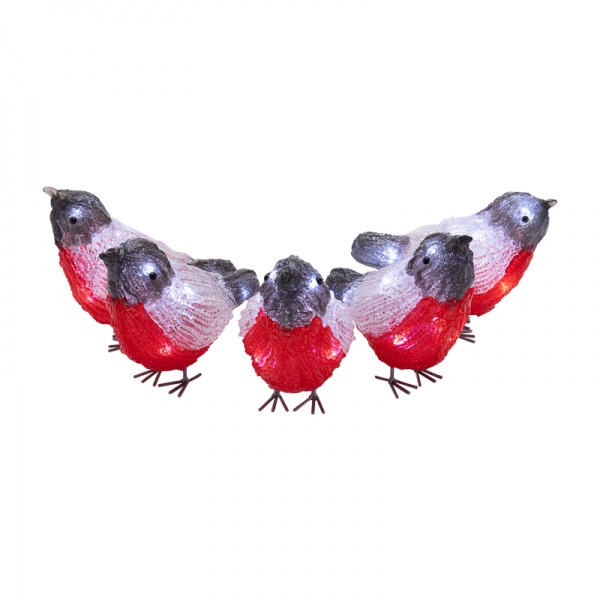Набор акриловых светодиодных фигур «Семья снегирей» состоит из пяти декоративных птиц, каждая из которых имеет высоту 13 см. Украшение выполнено из прочного полимера с фактурной поверхностью. В фигурках находится по 8 ярких диодов, светящихся белым, и создающих эффект объемного контура. В комплекте идут трансформатор для подключения к электрической сети, преобразующий входное напряжение до 4,5 В. Декоративные светодиодные фигурки защищены от влаги и пыли по стандарту IP65 — могут использоваться как в помещениях, так и на улице.