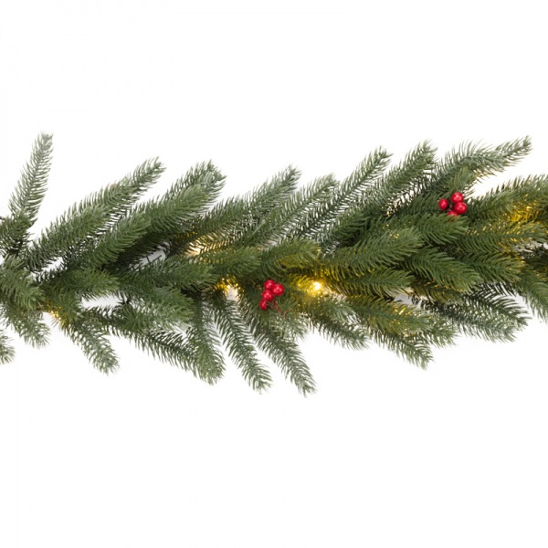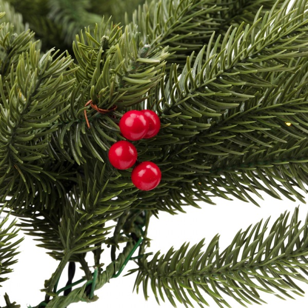 Еловый шлейф с ягодами и гирляндой длиной 1.8 метра состоит из 175 литых веток и 48 ярко-красных плодов. Эффектная новогодняя композиция подсвечивается 30 диодами, которые излучают белый свет теплого оттенка. Гирлянда защищена от попадания влаги и пыли по стандарту IP44, поэтому подходит для использования как в помещении, так и на улице. Украшение с гибким основанием дает большие возможности в создании оригинального праздничного декора в любых сценариях и арт-объектах. Изделие питается от сети 230 В, в комплект входит трансформатор.