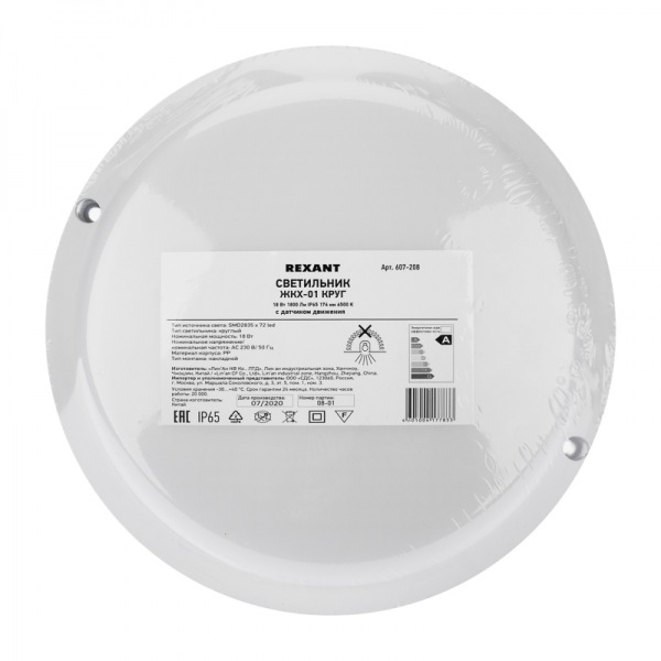 Купить Светильник общего назначения Светильник светодиодный пылевлагозащищенный Рексант ЖКХ-01 круг 18 Вт 1800 Лм IP65 174 мм 6500 K с датчиком движения в Москве или заказать с доставкой по России можно на нашем сайте СинтезБезопасности.ру. Здесь вы найдете описание, фото, технические характеристики и цену на Светильник светодиодный пылевлагозащищенный REXANT ЖКХ-01 круг 18 Вт 1800 Лм IP65 174 мм 6500 K с датчиком движения.