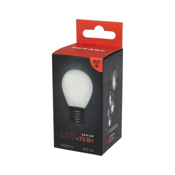 Филаментная матовая лампа REXANT GL45 в форме шара мощностью 9.5Вт с цоколем E27 и с белым свечением в 4000K прекрасно подходит для дизайнерского освещения комнат, домов, гостиниц, кафе, и других объектов.