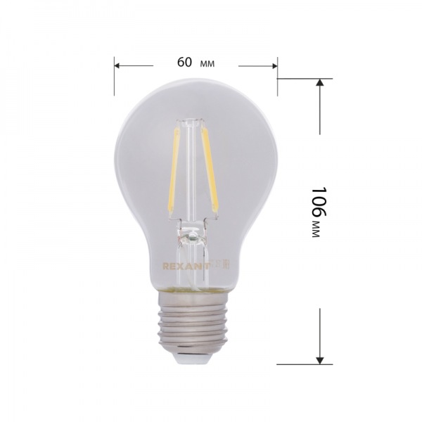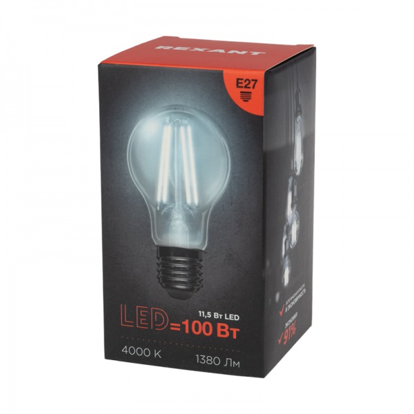 Филаментная прозрачная лампа REXANT А60 в форме груши мощностью 11.5Вт с цоколем E27 и с белым свечением в 4000K прекрасно подходит для дизайнерского освещения комнат, домов, гостиниц, кафе, и других объектов.