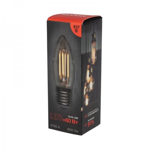 Филаментная прозрачная лампа REXANT CN35 в форме свечи мощностью 7.5Вт с цоколем E27 и с теплым белым свечением в 2700K прекрасно подходит для дизайнерского освещения комнат, домов, гостиниц, кафе, и других объектов.