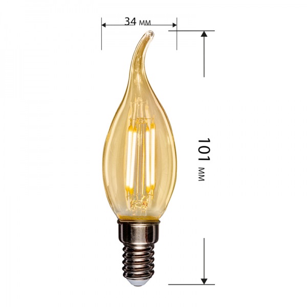 Филаментная золотистая лампа REXANT CN37 в форме свечи на ветру мощностью 9.5Вт с цоколем E14 и с теплым белым свечением в 2700K прекрасно подходит для дизайнерского освещения комнат, домов, гостиниц, кафе, и других объектов.
